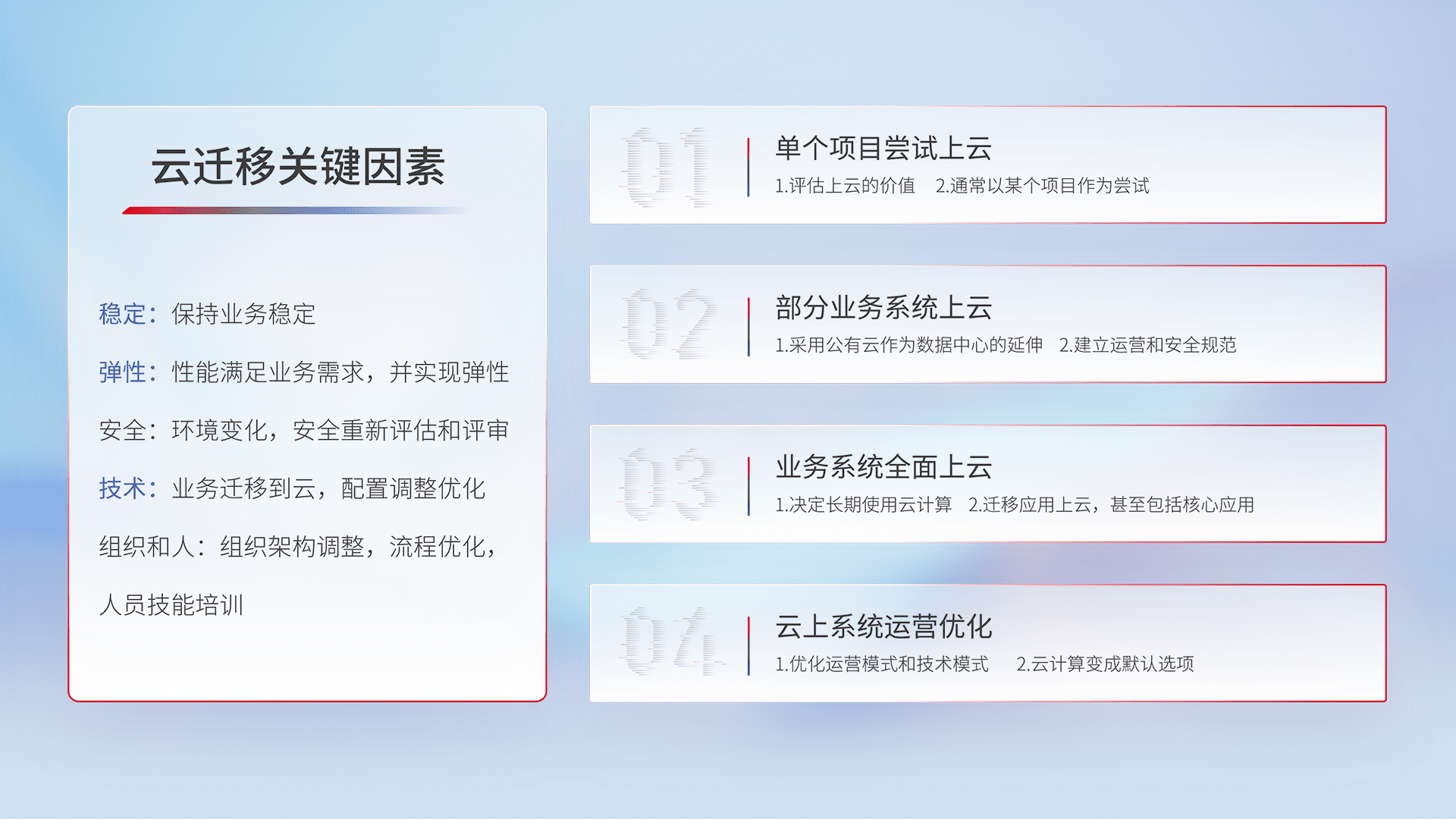结合实际业务,,从规划设计、、、、云平台选型、、、、云原生改造、、、数据迁移、、、集成交付,,,,迁移全过程为客户识别最佳上云路径,,,做好风险识别管理,,设计网络架构、、、身份权限、、安全审计合规、、、、操作审计、、、日志审计、、监控告警策略、、多站点容灾设计等,,,对云上基础设施进行整体规划,,,提升IT治理水平,,,以满足弹性、、、高可用、、高性能的需求。。。。